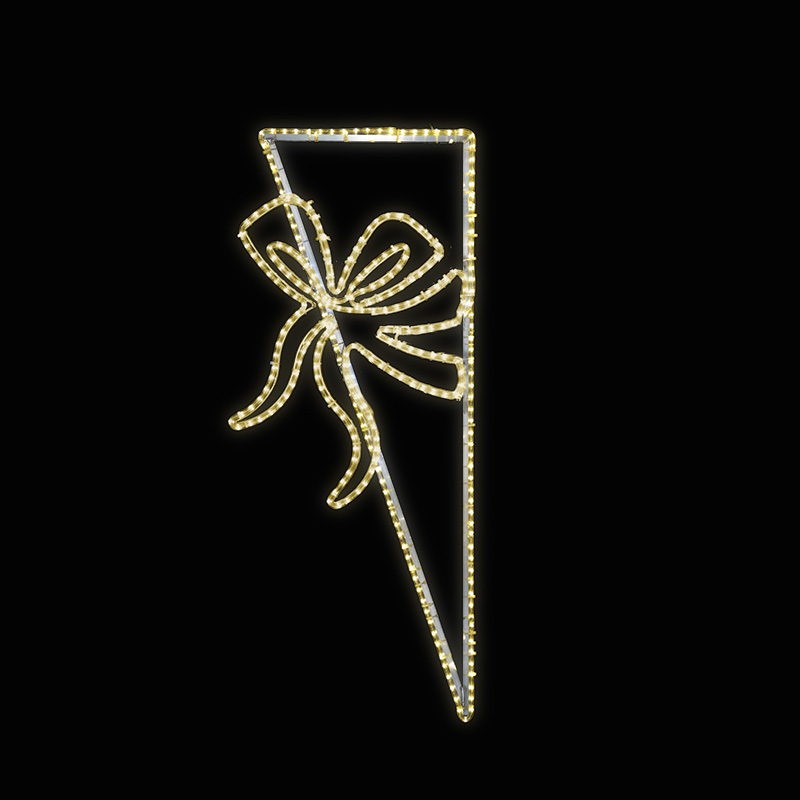 Dekor trojúhleník s mašlí malý LED 1293 pro vnitřní i venkovní použití 2 barvy světelného LED kabelu příkon 32 W, s výpletem 39 W výška 140 cm x šířka 58 cm váha 3,6 kg, s výpletem 4,2 kg duralová konstrukce osazena LED světelným kabelem, výplet z LED světelného řetězu Možnosti umístění dekoru: o... celý popis