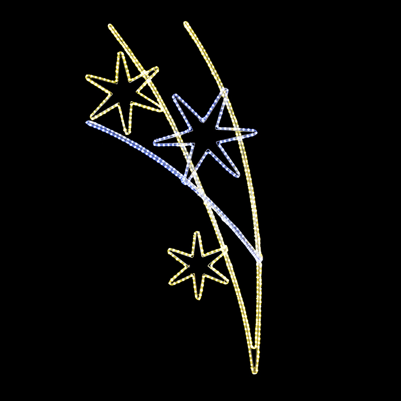 Dekorace 3 hvězdy na prutech pro vnitřní i venkovní použití LED kabel příkon 67 W výška 224 cm x šířka 106 cm váha 6,8 kg duralová konstrukce osazena LED světelným kabelem Možnosti umístění dekoru: ozdoba sloupu veřejného osvětlení - rozteč 1 m - potřeba 2 úchytů rovnoběžně s fasádou kolmo na fas... celý popis
