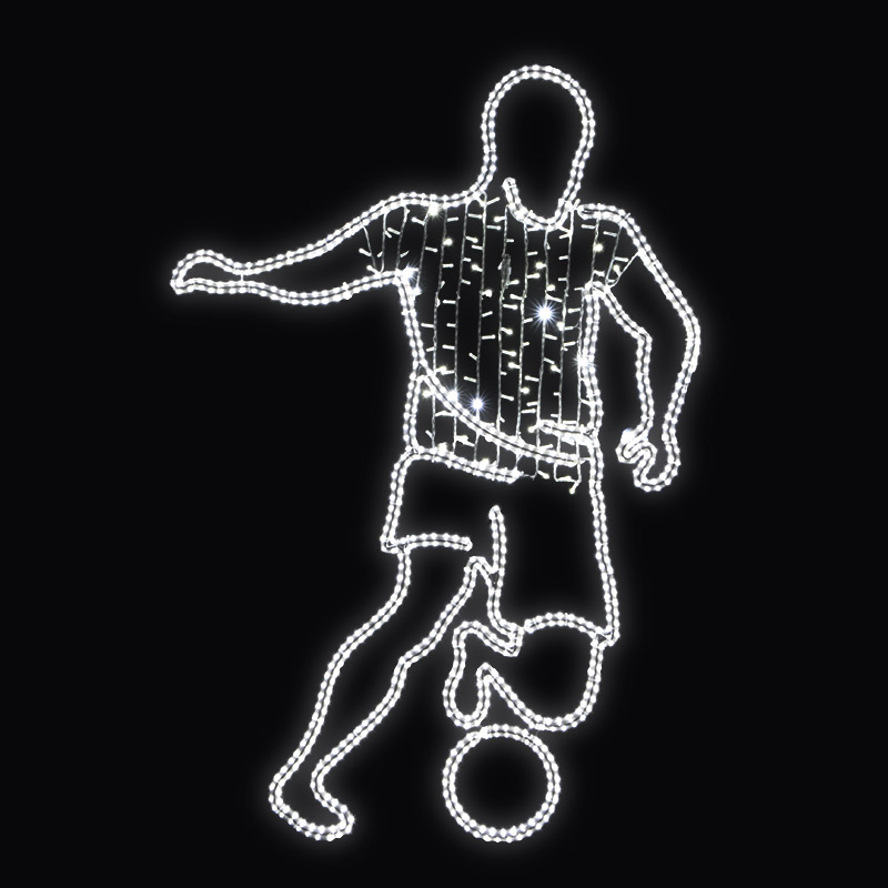 Fotbalista LED dekor pro vnitřní i venkovní použití příkon 81 W, s výpletem 88 W výška 207 x šířka 140 cm váha 8,5 kg, s výpletem 9,5 kg duralová konstrukce osazena LED světelným kabelem, výplet z LED světelného řetězu Možnosti (varianty) doplnění: barevné varianty dekoru Možnosti umístění dekor... celý popis