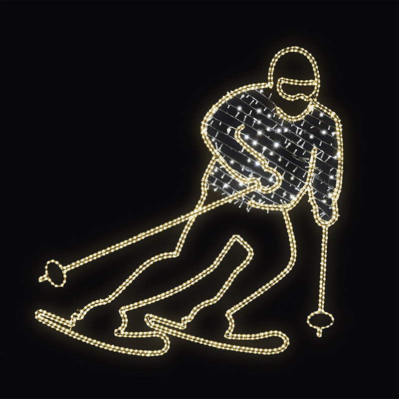 Lyžař LED deko pro vnitřní i venkovní použití příkon 98 W, s výpletem 110 W výška 188 x šířka 183 cm váha 10,3 kg, s výpletem 11,3 kg duralová konstrukce osazena LED světelným kabelem, výplet z LED světelného řetězu Možnosti (varianty) doplnění: barevné varianty dekoru Možnosti umístění dekoru: ... celý popis