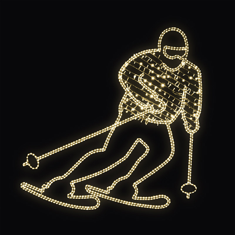 Lyžař LED deko pro vnitřní i venkovní použití příkon 98 W, s výpletem 110 W výška 188 x šířka 183 cm váha 10,3 kg, s výpletem 11,3 kg duralová konstrukce osazena LED světelným kabelem, výplet z LED světelného řetězu Možnosti (varianty) doplnění: barevné varianty dekoru Možnosti umístění dekoru: ... celý popis