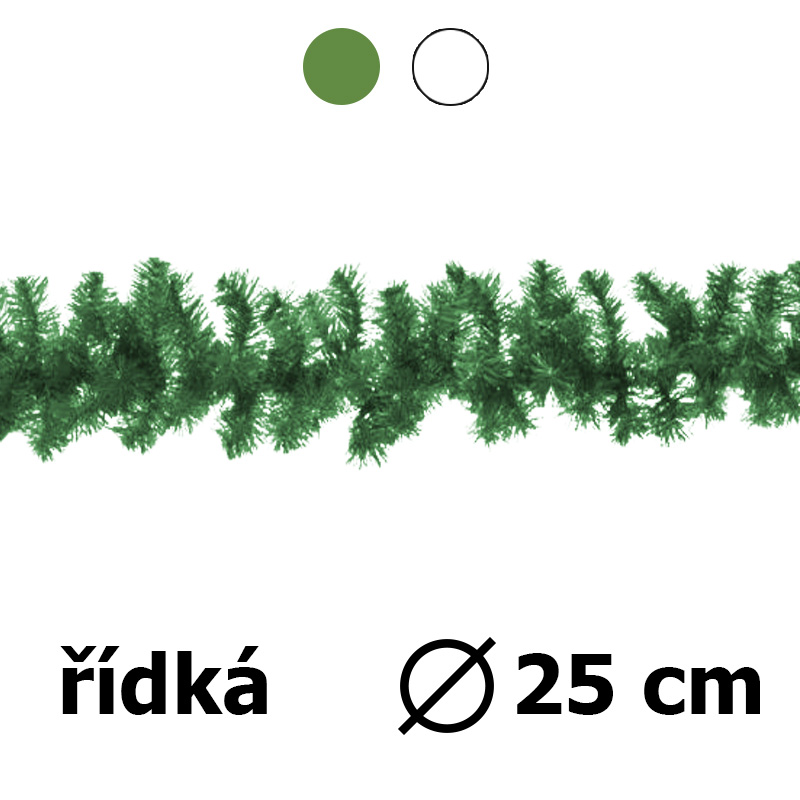 PVC girlanda, barvy: zelený smrk, svatební bílá, průměr 25cm, délka 2,7m, počet větví 198, počet větví na 1m je 73