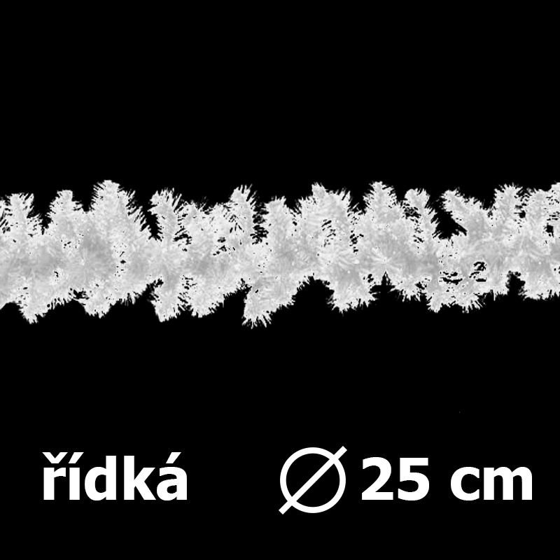 PVC girlanda, barvy: zelený smrk, svatební bílá, průměr 25cm, délka 2,7m, počet větví 198, počet větví na 1m je 73