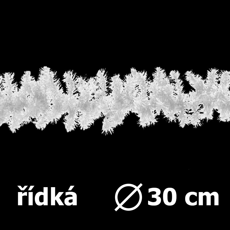 PVC girlanda, barvy: zelený smrk, svatební bílá, průměr 30cm, délka 2,7m, počet větví 198, počet větví na 1m je 73