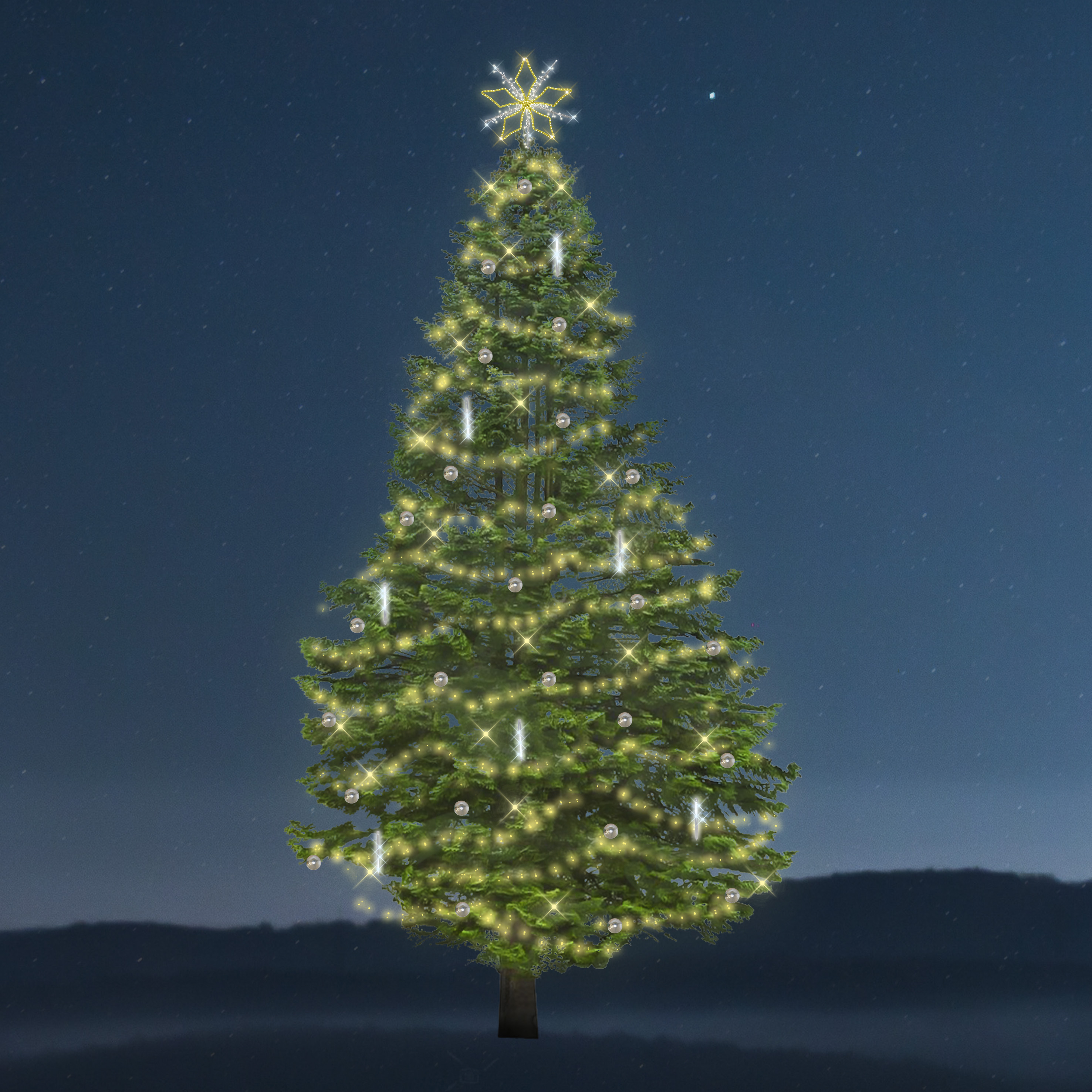 Vánoční sada osvětlení na stromy "Classic - Snowfall" (3309 LED) v příjemném tónu stále svítících řetězů teplé bílé barvy, doplněno řetězy Snowfall, LED padajícím světlem studené bílé barvy, které vytváří efekt padajícího sněhu. Na výběr jsou barevné varianty koulí. Celková spotřeba 253 W.
