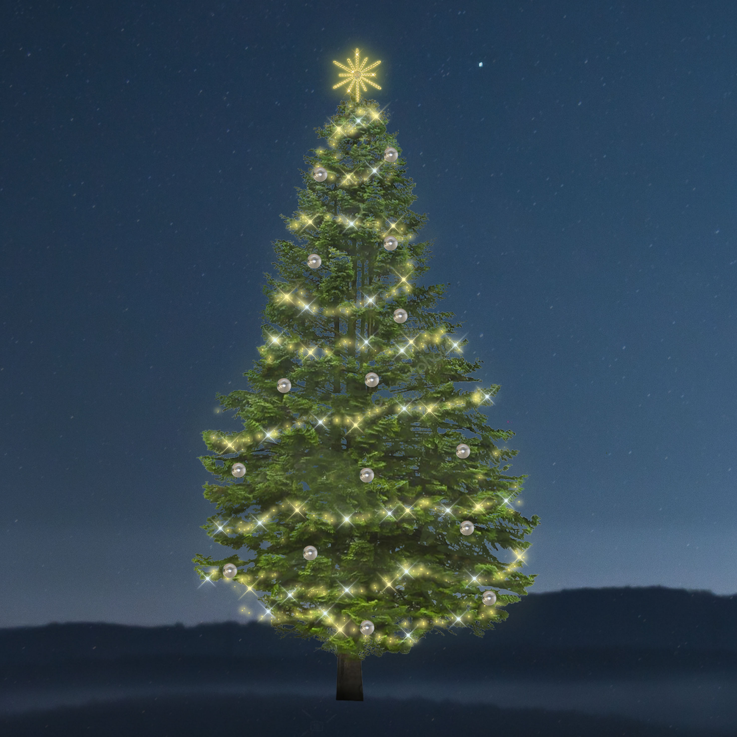 Vánoční sada osvětlení na stromy FLASH (1180 LED) s efektem, který vytváří třpyt. Barva stále svítících LED diod je teplá bílá, záblesk je v barvě studené bílé. Na výběr jsou barevné varianty koulí. Celková spotřeba 112 W.