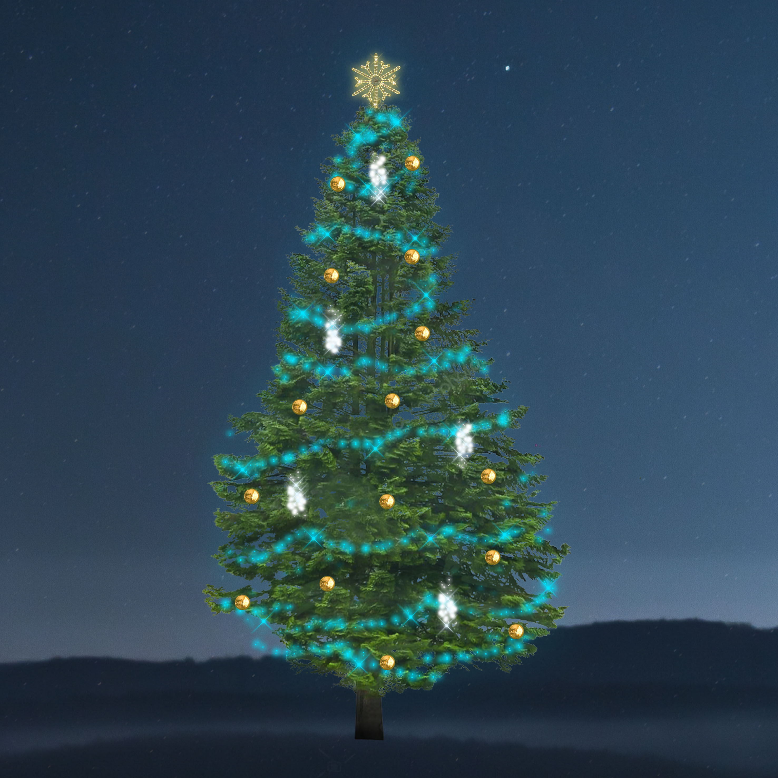 Vánoční sada osvětlení na stromy Synchrone - Snowdrop (1600 LED) s řetězy, které využívají GPS signál k ovládání efektů a barev. Přijímač je součástí světelného řetězu a každý družicový signál umožní spouštět nastavené činnosti světla. Pro správnou funkčnost je potřeba umístit GPS modul ve venkovních prostorách na dosah družicového signálu (spojitelné 7 ks na 1 GPS modul). Nelze měnit barvu, rychlosti ani pořadí efektů. Barva řetězu je RGB. Doplněno řetězy Snowdrop, LED padajícím světlem studené bílé barvy, které vytváří efekt padajícího sněhu. Na výběr barevné varianty koulí. Celková spotřeba 145 W.