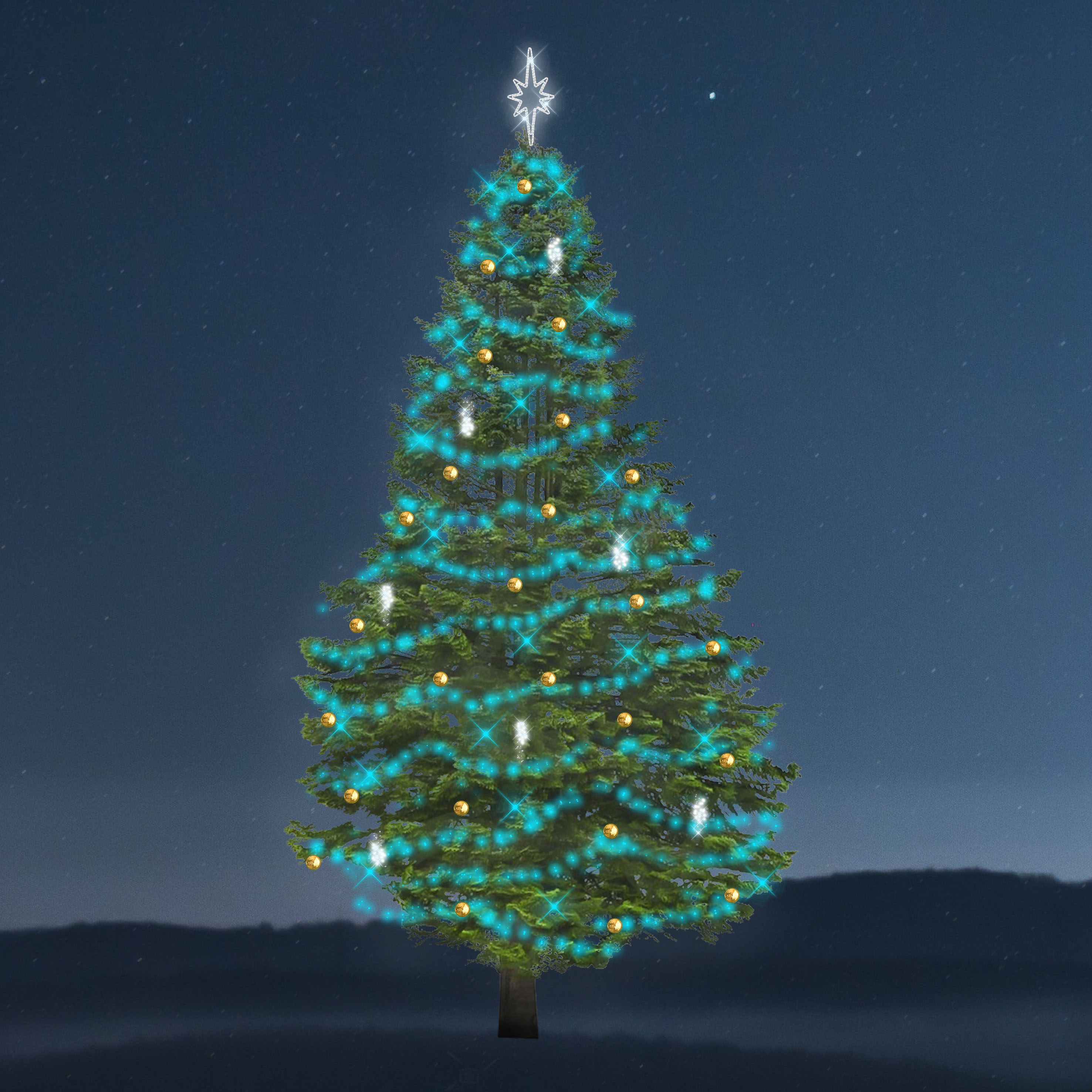 Vánoční sada osvětlení na stromy Synchrone - Snowdrop (3246 LED) s řetězy, které využívají GPS signál k ovládání efektů a barev. Přijímač je součástí světelného řetězu a každý družicový signál umožní spouštět nastavené činnosti světla. Pro správnou funkčnost je potřeba umístit GPS modul ve venkovních prostorách na dosah družicového signálu (spojitelné 7 ks na 1 GPS modul). Nelze měnit barvu, rychlosti ani pořadí efektů. Barva řetězu je RGB. Doplněno řetězy Snowdrop, LED padajícím světlem studené bílé barvy, které vytváří efekt padajícího sněhu. Na výběr barevné varianty koulí. Celková spotřeba 292,5 W.