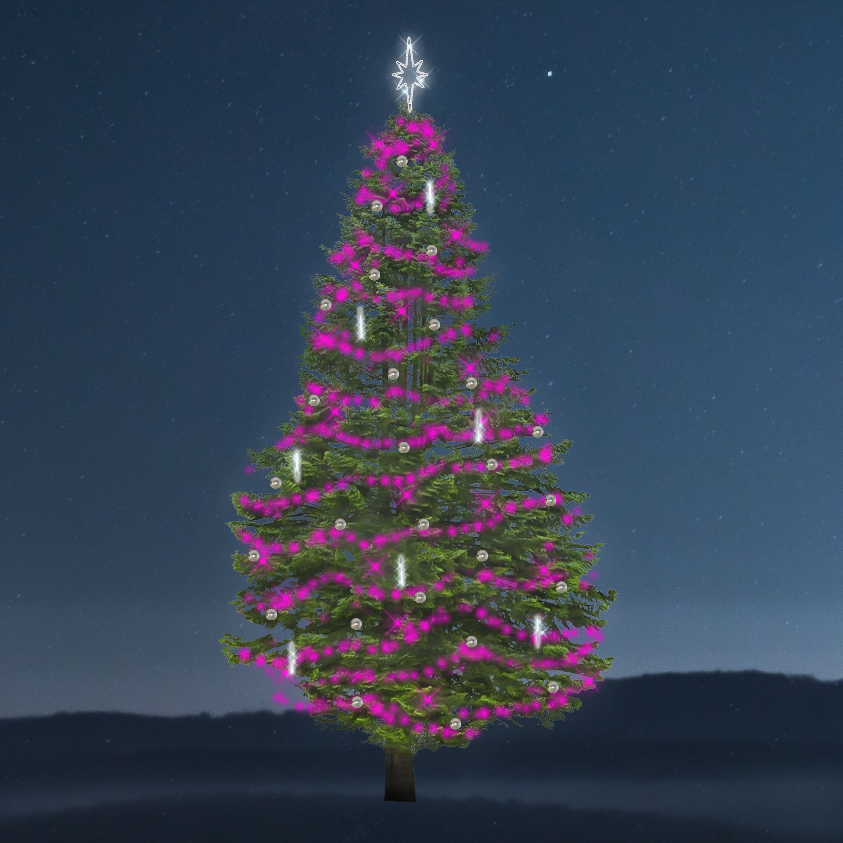 Vánoční sada osvětlení na stromy Synchrone - Snowfall (3336 LED) s řetězy, které využívají GPS signál k ovládání efektů a barev. Přijímač je součástí světelného řetězu a každý družicový signál umožní spouštět nastavené činnosti světla. Pro správnou funkčnost je potřeba umístit GPS modul ve venkovních prostorách na dosah družicového signálu (spojitelné 7 ks na 1 GPS modul). Nelze měnit barvu, rychlosti ani pořadí efektů. Barva řetězu je RGB. Doplněno řetězy Snowfall, LED padajícím světlem studené bílé barvy, které vytváří efekt padajícího sněhu. Na výběr barevné varianty koulí. Celková spotřeba 285 W.