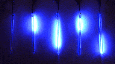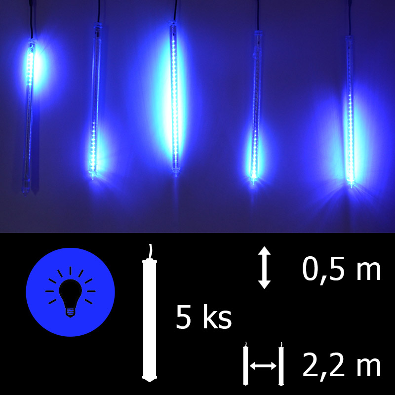 Venkovní i vnitřní, oboustranné provedení, délka trubic 0,5 m, vzdálenost mezi trubicemi 2,2m, počet trubic v balení 5ks, krytí IP64, příkon 14 W, barva diod modrá, počet LED diod 240ks, napájení 230 V