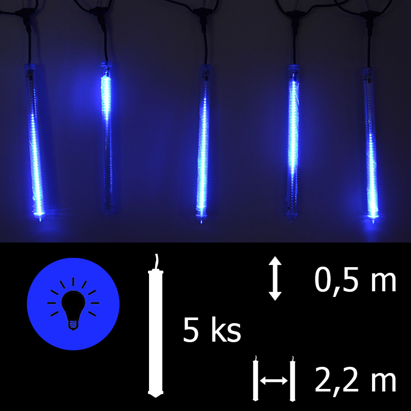 Venkovní i vnitřní, jednostranné provedení, délka trubic 0,5m, vzdálenost mezi trubicemi 2,2m, počet trubic v balení 5ks, krytí IP64, příkon 14 W, barva diod modrá, počet LED diod 240ks, napájení 230 V