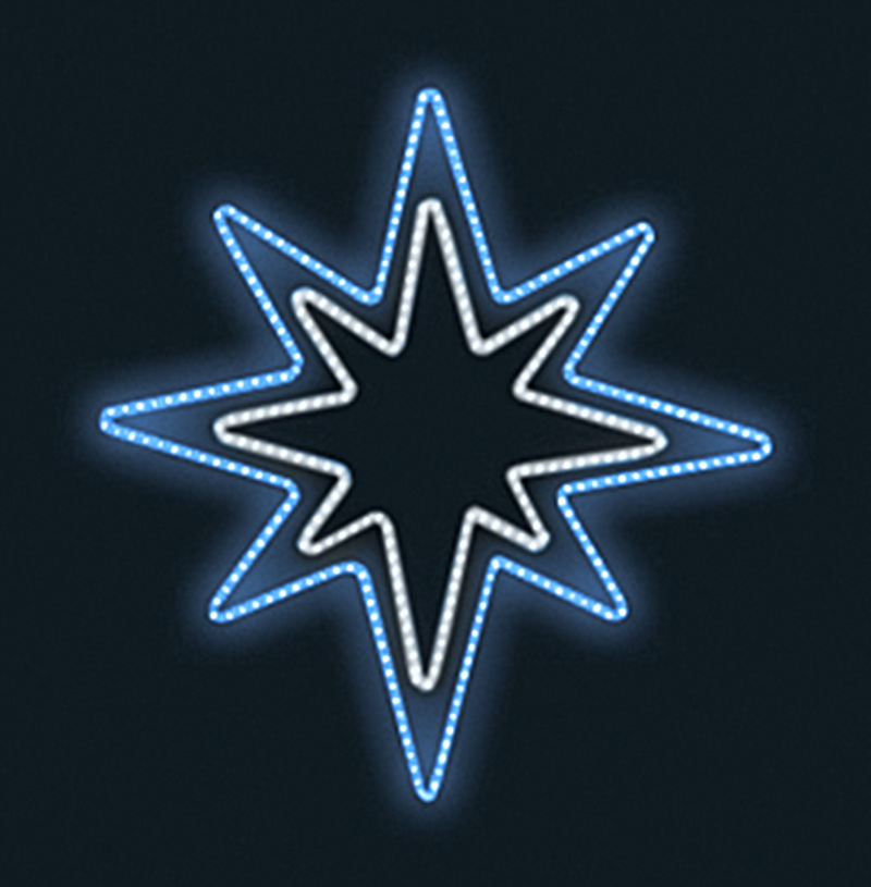 Světelný Dekor hvězda LED 5691 pro vnitřní i venkovní použití 2 barvy světelného LED kabelu příkon 35 W výška 137 x šířka 130 cm váha 4,8 kg duralová konstrukce osazena LED světelným kabelem Možnosti (varianty) doplnění: barevné varianty dekoru výplet z LED řetězů Možnosti umístění dekoru: ozd... celý popis