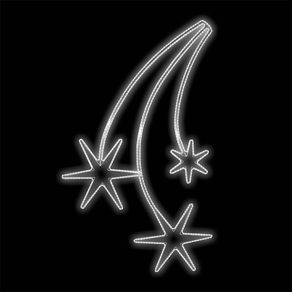Světelný dekor 3 padající hvězdy velké Kompletní specifikace dekoru: pro vnitřní i venkovní použití příkon 70 W výška 206 x šířka 157 cm váha 7,3 kg duralová konstrukce osazena LED světelným kabelem Možnosti (varianty) doplnění: barevné varianty dekoru Možnosti umístění dekoru: ozdoba sloupu ve... celý popis