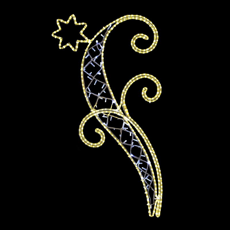 Světelný Kroucený dekor do špičky malý LED 1233 pro vnitřní i venkovní použití příkon 35 W, s výpletem 39 W výška 152 x šířka 81 cm váha 4,4 kg, s výpletem 4,8 kg duralová konstrukce osazena LED světelným kabelem, výplet z LED světelného řetězu Možnosti (varianty) doplnění: barevné varianty dekor... celý popis