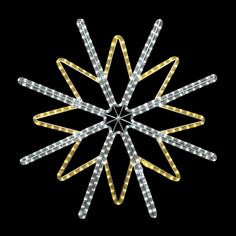 Světelný dekor Hvězda s vločkou pro vnitřní i venkovní použití 2 barvy světelného LED kabelu příkon 32 W výška 76 x šířka 76 cm váha 3,2 kg duralová konstrukce osazena LED světelným kabelem Možnosti (varianty) doplnění: barevné varianty dekoru Možnosti umístění dekoru: ozdoba sloupu veřejného o... celý popis
