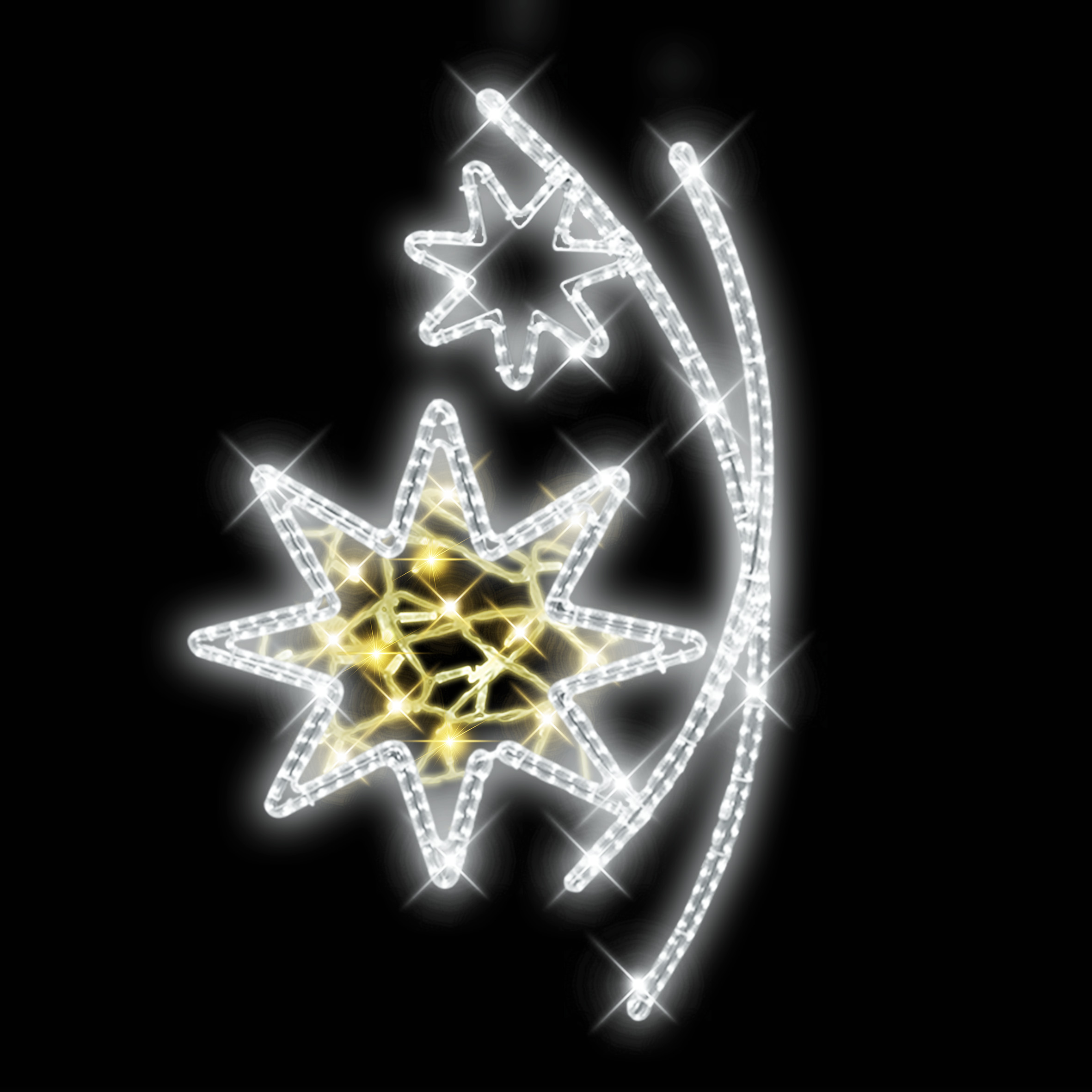 Světelný dekor Hvězdy v oblouku malé LED 1173 pro vnitřní i venkovní použití 2 barvy světelného LED kabelu bez výpletu příkon 42 W, 4,4, kg,  s výpletem příkon 50 W, 5,2 kg  výška 133 x šířka 81 cm duralová konstrukce osazena LED světelným kabelem, výplet z LED světelného řetězu  Možnosti (variant... celý popis