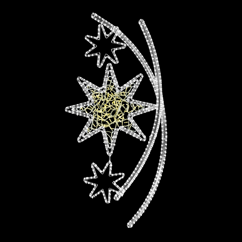Světelný dekor Hvězdy v oblouku střední LED 1172 pro vnitřní i venkovní použití 2 barvy světelného LED kabelu příkon 64 W s výpletem, 56 W bez výpletu váha 7 kg s výpletem, 5,8 kg bez výpletu výška 166 x šířka 69 cm duralová konstrukce osazena LED světelným kabelem, výplet z LED světelného řetězu ... celý popis