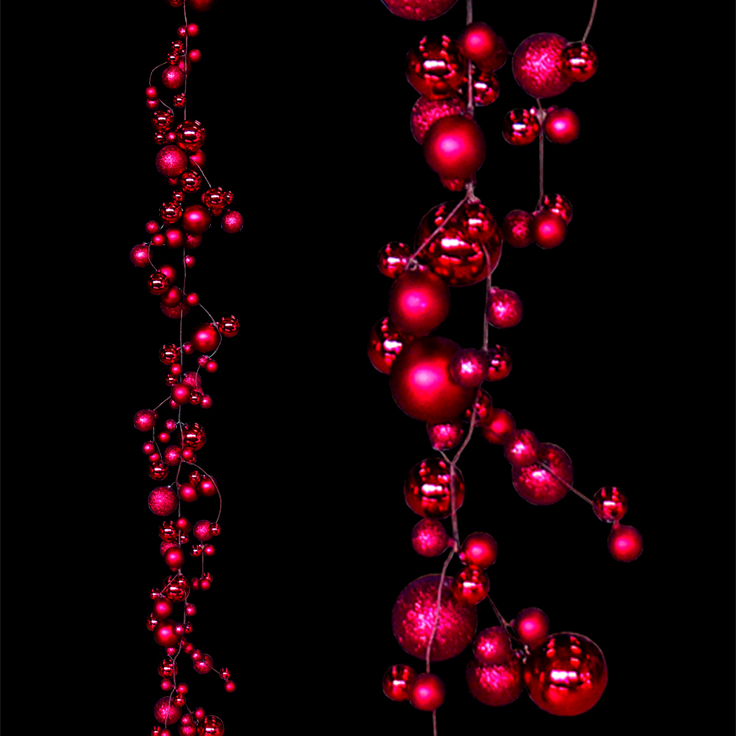 délka 150 cm, koule průměr 3 cm (72 ks), 5 cm (36 ks), 7 cm (12 ks), barva koulí červená