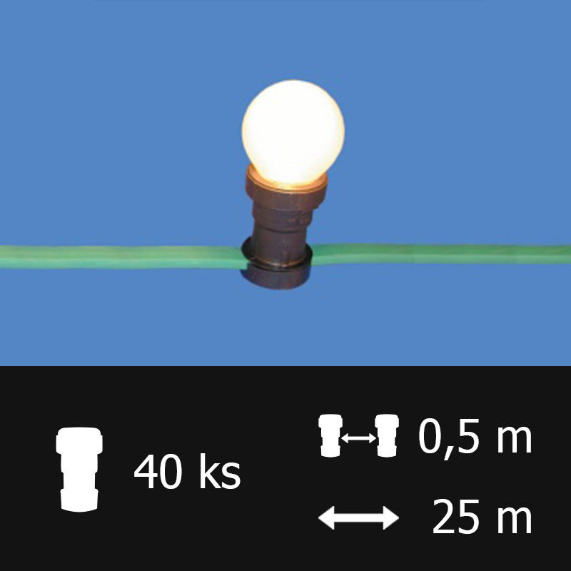 délka 25 m, 40 objímek, rozteč 0,5 m, 220-240 V (bez žárovek), krytí IP44