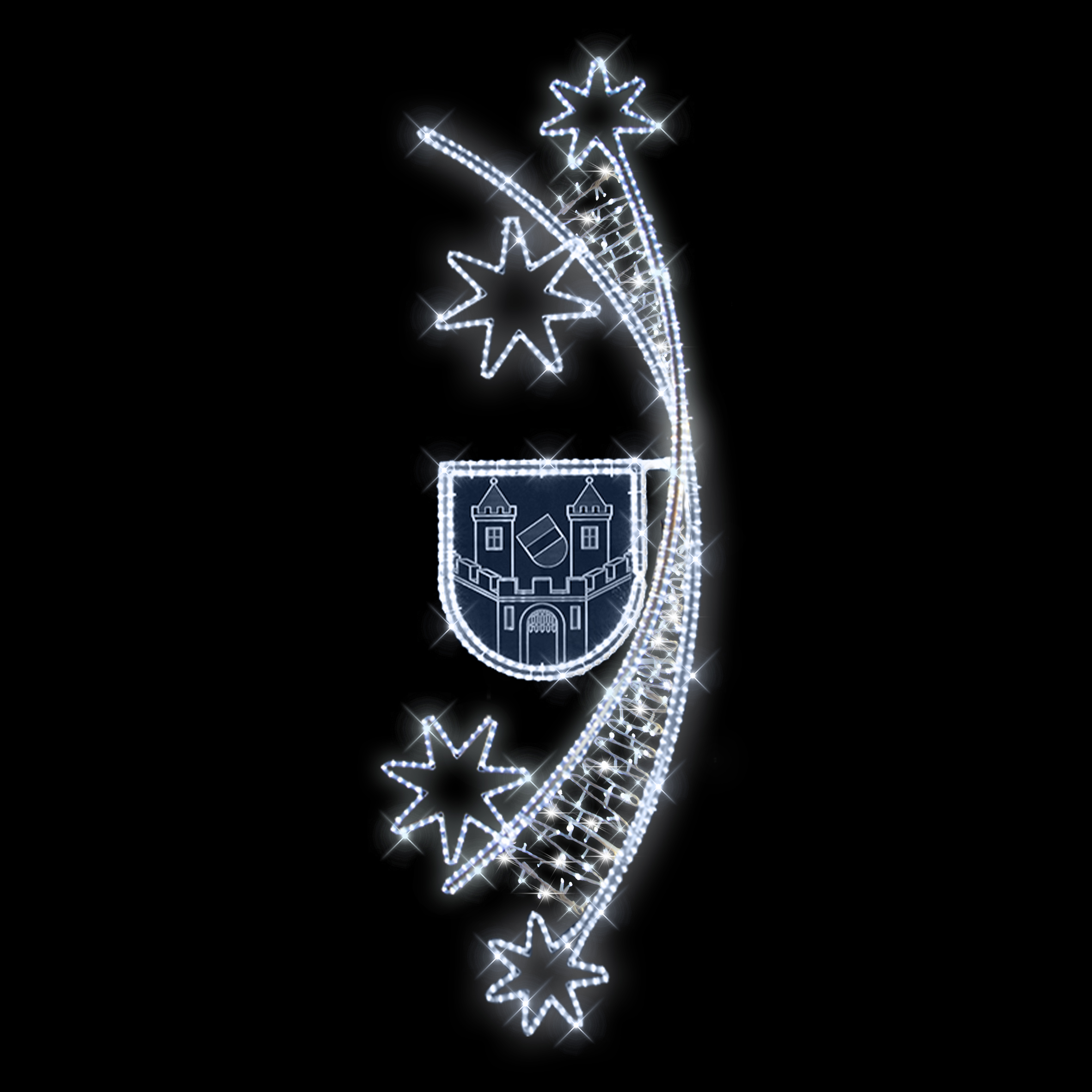 Dekorace hvězdy s oblohou s erbem pro vnitřní i venkovní použití kombinace LED kabelu a LED řetězu příkon 81 W výška 272 cm x šířka 75 cm váha 9,6 kg duralová konstrukce osazena LED světelným kabelem, výplet z LED světelného řetězu, doplněné gravírovanou vsadkou s vlastním motivem Možnosti umístěn... celý popis